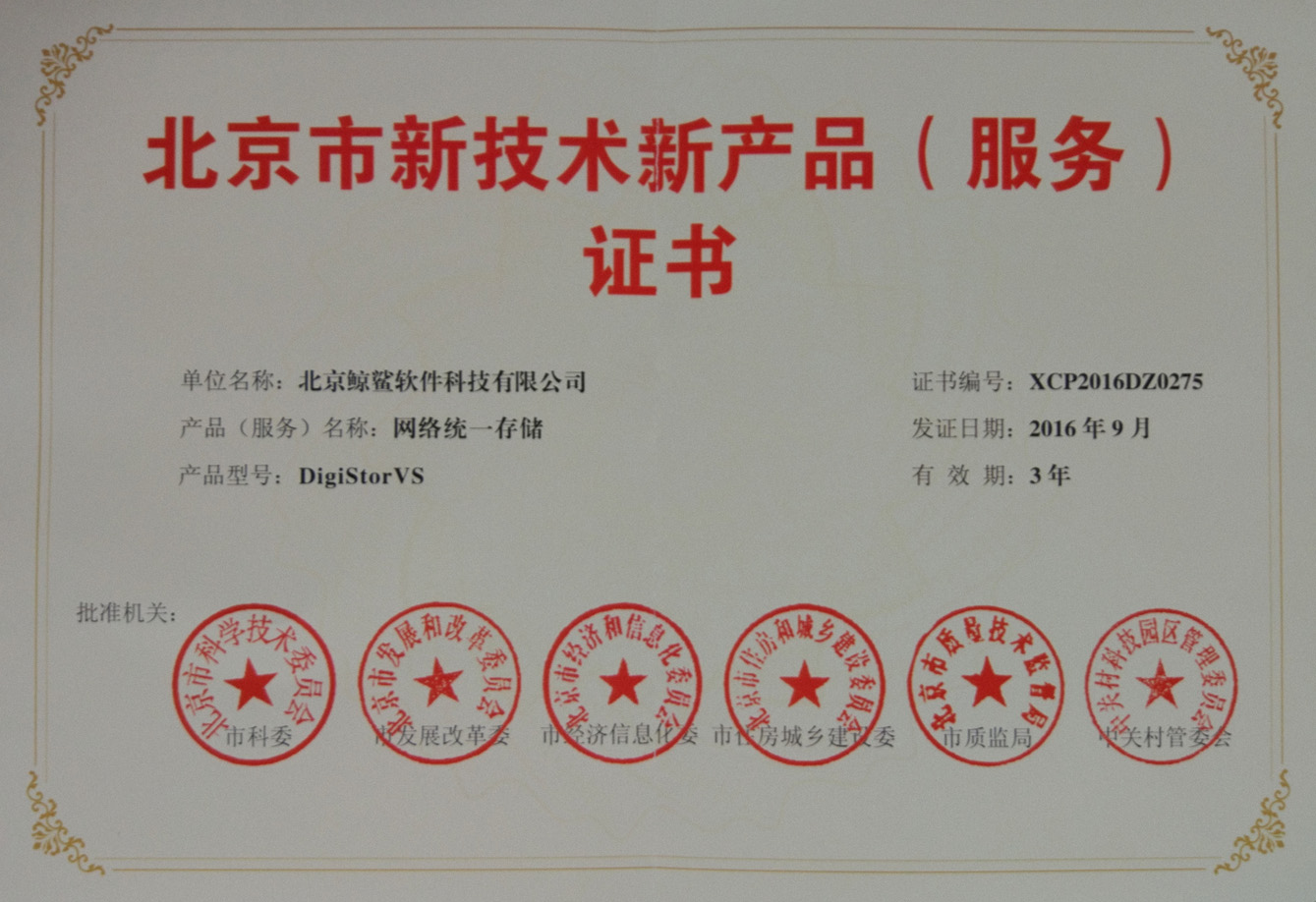 根據(jù)《北京市新技術(shù)新產(chǎn)品(服務(wù))認(rèn)定管理辦法)》的規(guī)定,經(jīng)專家評(píng)審及認(rèn)定小組審核,北京鯨鯊軟件科技有限公司自主研發(fā)的《網(wǎng)絡(luò)統(tǒng)一存儲(chǔ)》,型號(hào):DigiStor VS。近日被北京市科學(xué)技術(shù)委員會(huì)、北京市發(fā)展和改革委員會(huì)、北京市經(jīng)濟(jì)和信息化委員會(huì)、北京市住房和城鄉(xiāng)建設(shè)委員會(huì)、北京市質(zhì)量技術(shù)監(jiān)督局、中關(guān)村科技園區(qū)管理委員會(huì)六部門成功認(rèn)定為2016年第四批北京市新技術(shù)新產(chǎn)品。