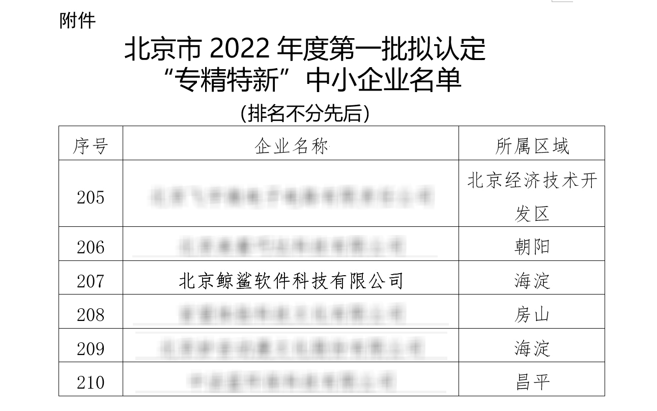 春風(fēng)不負(fù)趕路人,時光不負(fù)奮斗者。依托于十多年來的技術(shù)與產(chǎn)品的不斷創(chuàng)新和研發(fā)投入,2022年1月,北京鯨鯊軟件科技有限公司成功入圍:北京市2022年度第一批擬認(rèn)定“專精特新”中小企業(yè)名單。這為公司的進(jìn)一步發(fā)展和飛躍提供了更大的動力源泉。