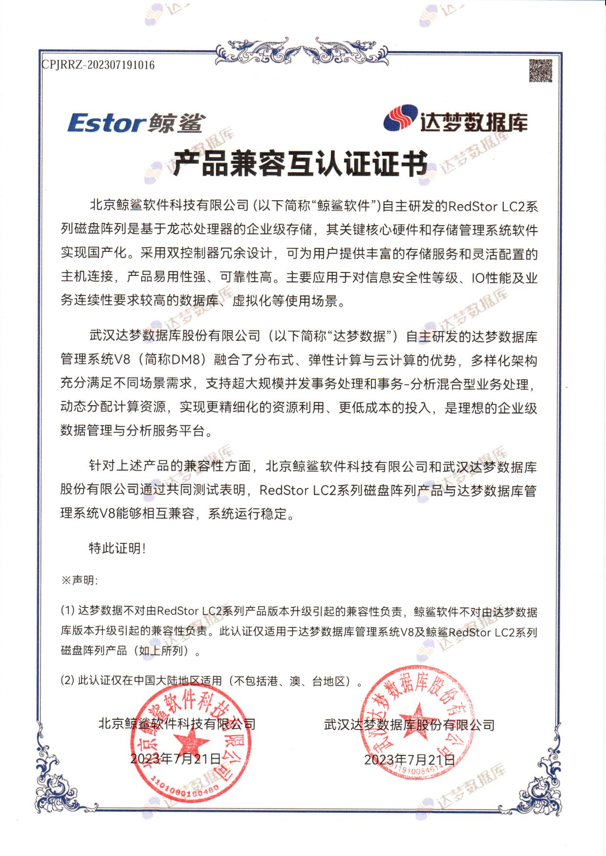 近日,鯨鯊RedStor LC2系列龍芯體系雙控存儲(chǔ)產(chǎn)品與達(dá)夢(mèng)MD8數(shù)據(jù)庫(kù)、人大金倉(cāng)KingbaseES V8、V9數(shù)據(jù)庫(kù)完成兼容性互認(rèn)證測(cè)試。測(cè)試結(jié)果顯示,鯨鯊RedStor LC2系列存儲(chǔ)與達(dá)夢(mèng)、人大金倉(cāng)數(shù)據(jù)庫(kù)兼容性良好,系統(tǒng)功能運(yùn)行穩(wěn)定。