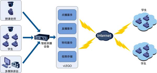 vLEGO融合基礎(chǔ)架構(gòu)一體機(jī)的虛擬化及集群存儲(chǔ)技術(shù)是該市教育局關(guān)注的產(chǎn)品亮點(diǎn)。全市23所學(xué)校中,均采用vLEGO融合基礎(chǔ)架構(gòu)一體機(jī)與錄播設(shè)備配合工作,搭建成一套全自動(dòng)錄播系統(tǒng),錄播設(shè)備負(fù)責(zé)多路的影像與音頻的采集,在vLEGO融合基礎(chǔ)架構(gòu)一體機(jī)中運(yùn)行多個(gè)虛擬機(jī),分別承擔(dān)錄制、轉(zhuǎn)碼、編輯、點(diǎn)播等功能。