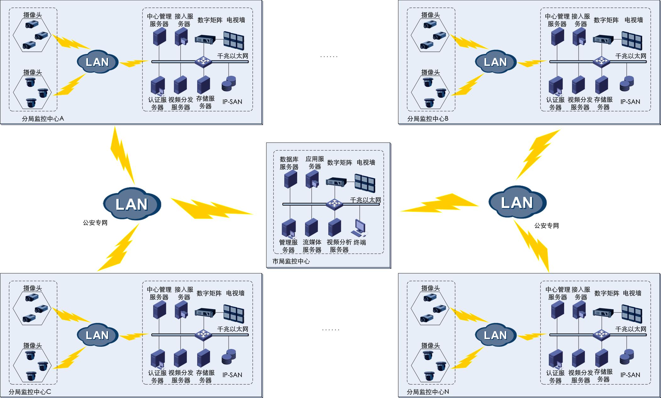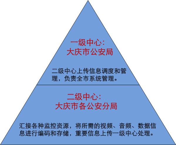 根據(jù)大慶公安局高清監(jiān)控系統(tǒng)的實(shí)際情況構(gòu)成二級(jí)中心結(jié)構(gòu),市公安局指揮中心作為一級(jí)中心,預(yù)留與上級(jí)聯(lián)網(wǎng)接口,負(fù)責(zé)二級(jí)中心上傳信息調(diào)度和管理,負(fù)責(zé)全市系統(tǒng)管理。24個(gè)公安分局監(jiān)控中心作為二級(jí)中心,匯接各種監(jiān)控資源,將所需的視頻、音頻、數(shù)據(jù)信息進(jìn)行編碼和存儲(chǔ),重要信息上傳一級(jí)中心處理。