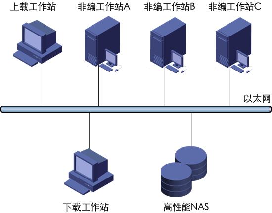 電視臺(tái)所配置的各種非編工作站通過IP網(wǎng)絡(luò)與后端存儲(chǔ)系統(tǒng)進(jìn)行連接;